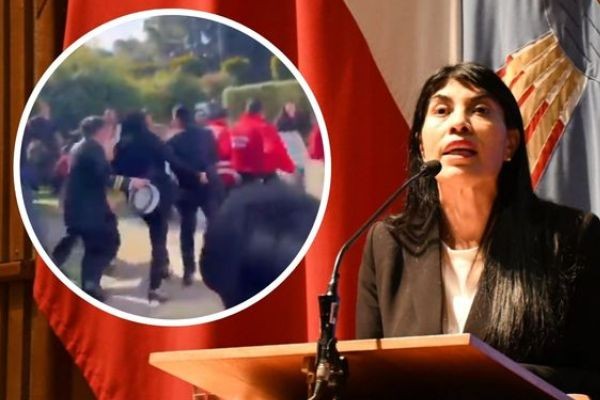 Según registros difundidos por diversos medios, la autoridad fue insultada y rociada con agua mientras se dirigía hacia su vehículo. En las imágenes se observa cómo debió retirarse rápidamente, resguardada por personal de seguridad, en medio de un ambiente de alta tensión.