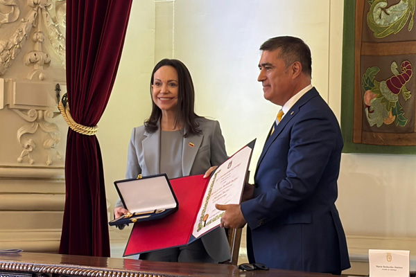 Machado agradeció el gesto a las autoridades presentes, destacando que es “un reconocimiento que ha dado el pueblo de Venezuela a su libertad, y por la libertad de toda la región”.