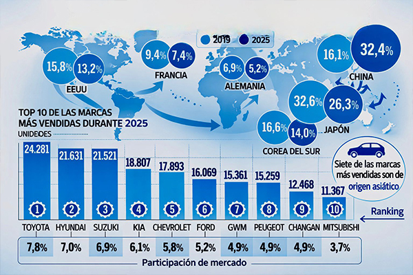 De acuerdo con los datos, en 2025, las marcas chinas superaron las 100.000 unidades vendidas; las japonesas rondaron las 81.000 y las coreanas 43.000. En total, las asiáticas alcanzaron cerca del 72% del mercado local.