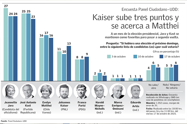 La exministra del Trabajo, Jeannette Jara (Partido Comunista), es la candidata favorita en la carrera presidencial con un 24% de las preferencias, según la encuesta Panel Ciudadano UDD correspondiente a este 17 de octubre de 2025.