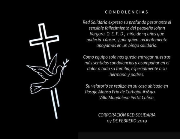 A través de un comunicado compartido en sus redes sociales, Red Solidaria Colina informó sobre el fallecimiento de Johnn Vergara, niño de 13 años que padecía un cáncer gástrico y por el cual fue desahuciado por los médicos.