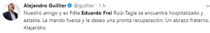 Compañeros políticos del ex presidente lo han ido a visitar y han manifestado su apoyo. “Nuestro amigo y ex presidente Eduardo Frei Ruiz -Tagle se encuentra hospitalizado y estable. Le mando fuerza y le deseo una pronta recuperación. Un abrazo fraterno”, escribió el candidato presidencial Alejandro Guillier. La actual jefe de estado también se sumó al apoyo por redes sociales: “deseo al ex presidente Eduardo Frei, la más pronta recuperación. Chile sigue requiriendo de su invaluable aporte al fortalecimiento de nuestra democracia”. CHH