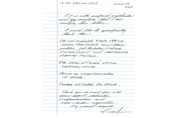 En la misiva, el actor agradece al FBI, la Policía Local de Los Ángeles y la Policía de Investigaciones de Santiago de Chile.