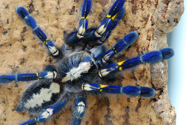 Se trata de una araña Poecilotheria metallica y se caracteriza por su fuerte color azul brillante y pequeñas manchas blancas ubicadas en sus patas y tórax. El hábitat natural de la especie se encuentra en Andhra Pradesh, en el centro sur de la India.