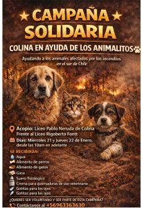 En paralelo, se desarrolla una campaña solidaria en apoyo a animales afectados por los incendios, iniciativa que busca acudir directamente a la zona de catástrofe. Según explicó su organizador, Felipe González a Chicureo Hoy, el objetivo es prestar ayuda en terreno, curar animales y entregar alimento hasta agotar lo recaudado. La campaña se extendió hasta el domingo 25 de enero.