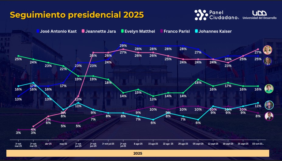 En el marco de las próximas elecciones presidenciales y parlamentarias del 16 de noviembre, en las que se deberá votar por diputados, senadores y el próximo Presidente de la República que sucederá al actual mandatario, Gabriel Boric, se dio a conocer una nueva encuesta del Panel Ciudadano UDD.