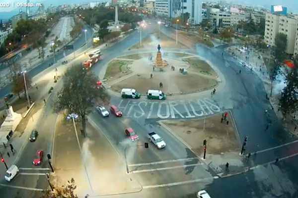 Carabineros publica en su cuenta de Twitter «Debido a la concentración de personas en Plaza Baquedano, la Prefectura Control de Orden Público ha detenido, al momento, a 33 personas por desórdenes públicos.»