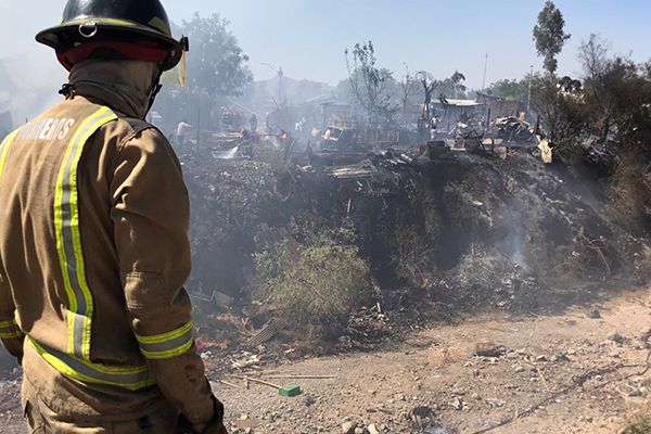 Hace unos minutos se controló un importante incendio estructural que tuvo lugar en un campamento de Colina, específicamente en el kilómetro 18,5 de la carretera General San Martín, en el sector Hermanos Carrera y Diego Portales, ubicado en Rivera Sur.