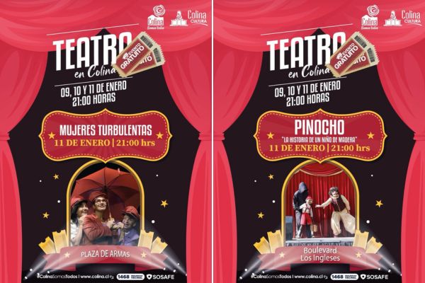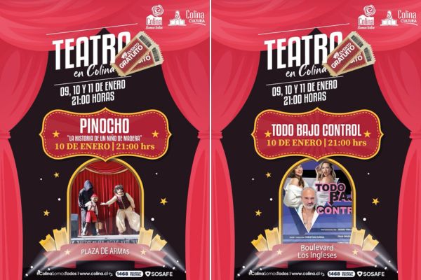 Desde el 9 al 11 de enero, Colina vivirá tres jornadas de teatro gratuito a las 21:00 horas en la Plaza de Armas y el Boulevard Los Ingleses. La programación incluye las obras “Todo Bajo Control”, “Mujeres Turbulentas” y “Pinocho: La historia de un niño de madera”.