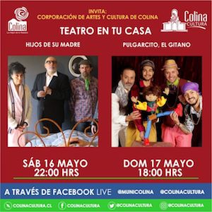 La Corporación de Artes y Cultura de Colina invita a la comunidad a seguir esta iniciativa de Teatro en tu casa, con distintas funciones para disfrutar en familia a través del Facebook Live de la Municipalidad de Colina.