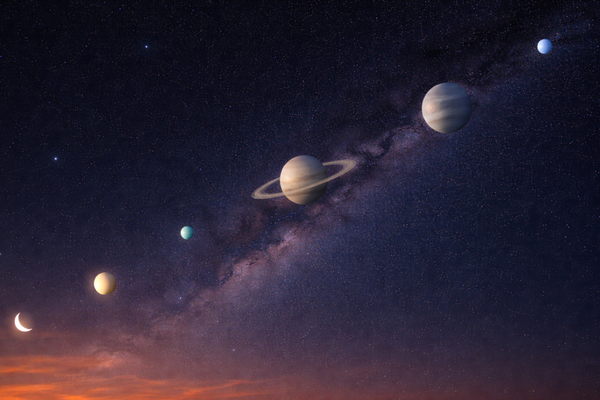 Una alineación planetaria —también llamada “desfile de planetas”— ocurre cuando varios planetas parecen agruparse en una misma región del cielo. Esto se debe a que orbitan el Sol en un plano similar, por lo que desde la Tierra se observan siguiendo una línea o arco aparente.